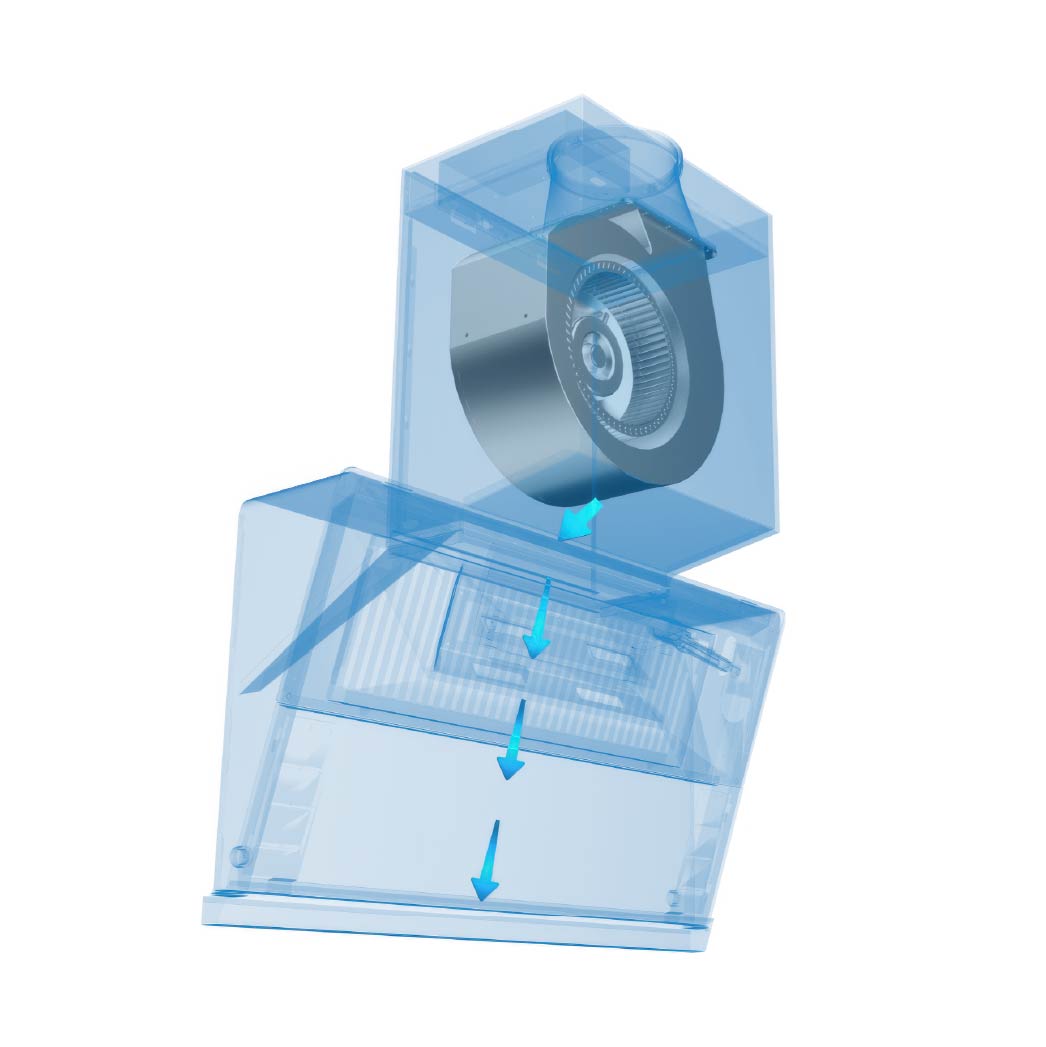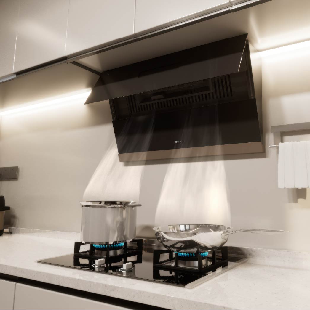 The intake shutter automatically opens and closes when the range hood is active or inactive, efficiently and securely capturing oily smoke